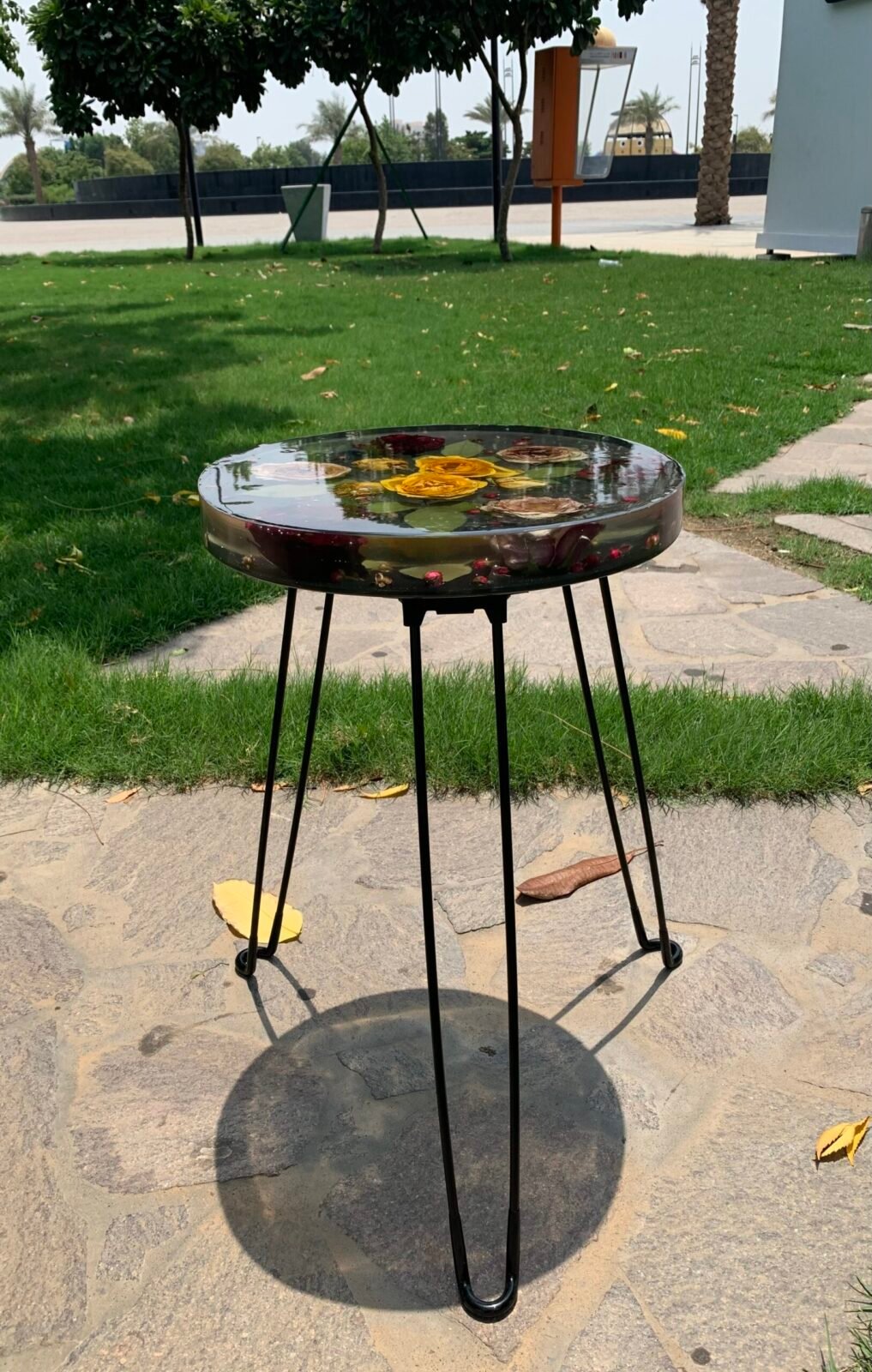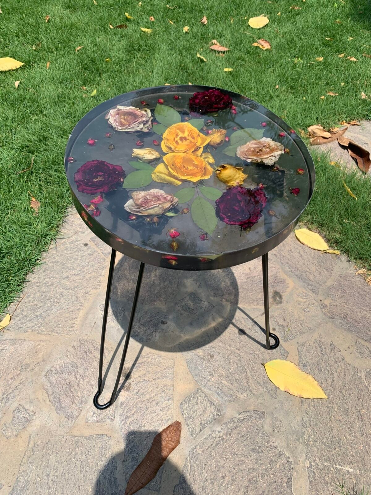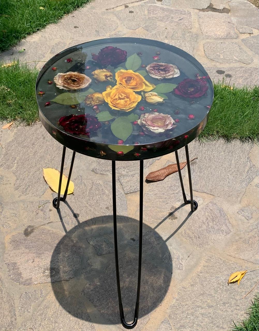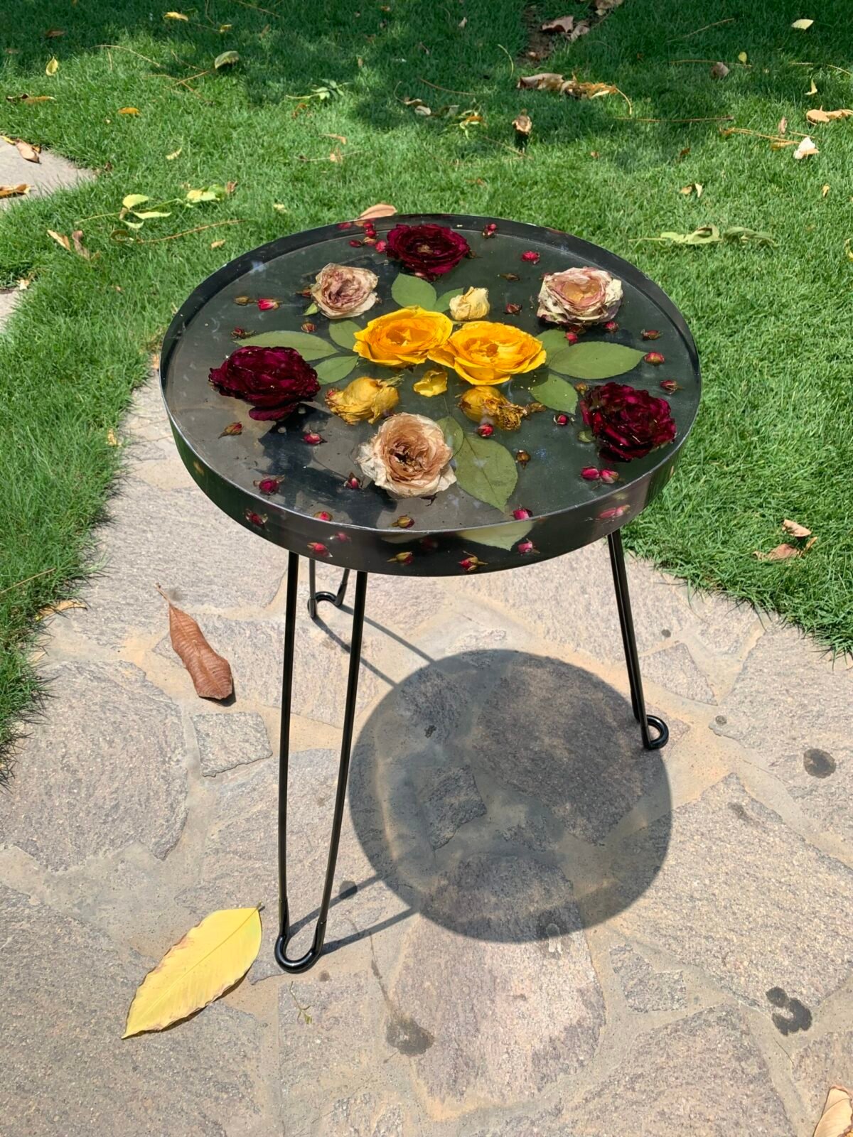 Rizen table with homemade dried roses 35 cm wide and 52 cm long with the possibility of choosing the customer’s favorite colors and accessories and the second size is 50 cm table width and leg length 52