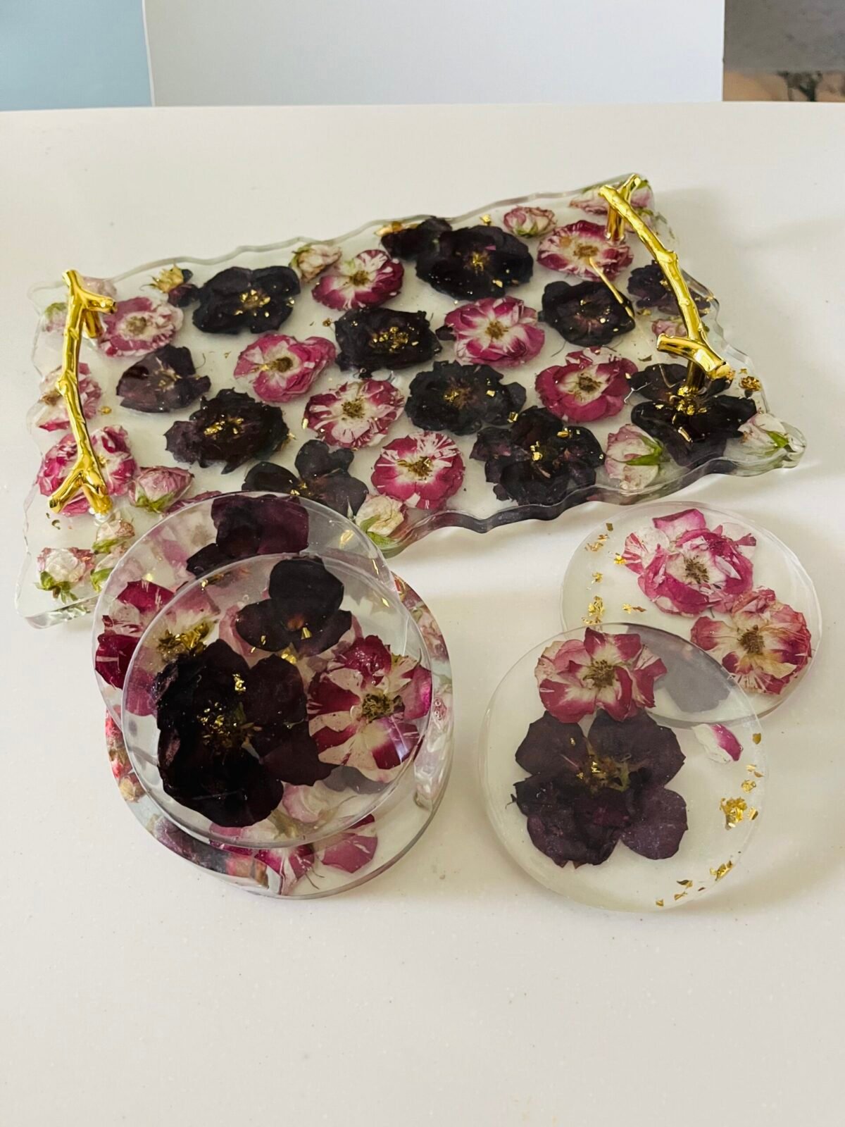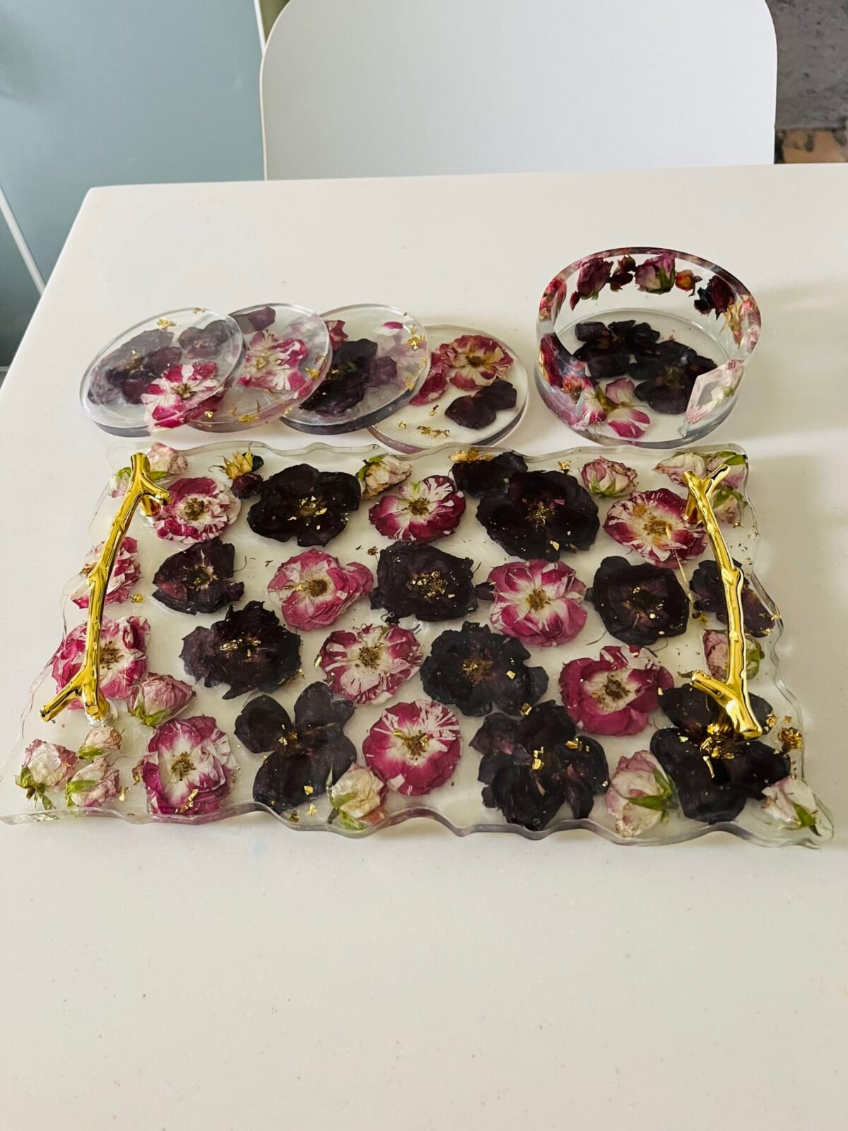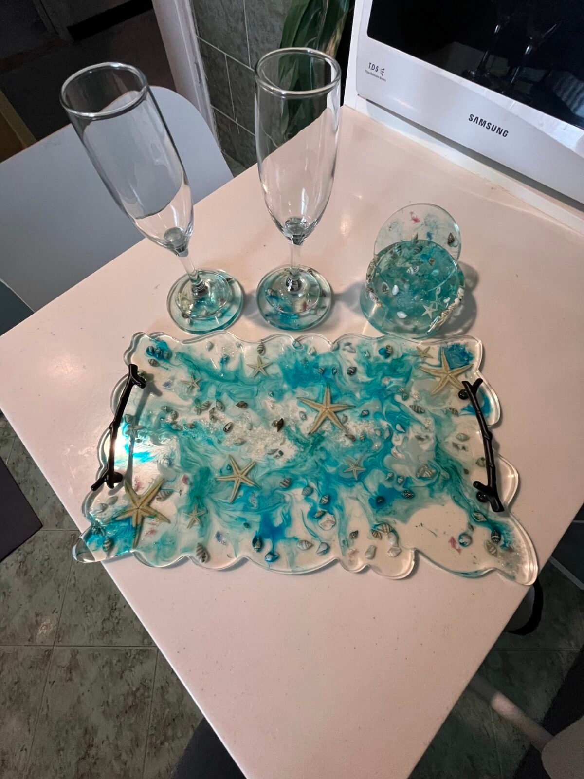 Serving tray +4 cup holders with their base made of Rizen, available in two sizes, large and small, with the possibility of the customer’s choice of additions of flowers and marine shapes