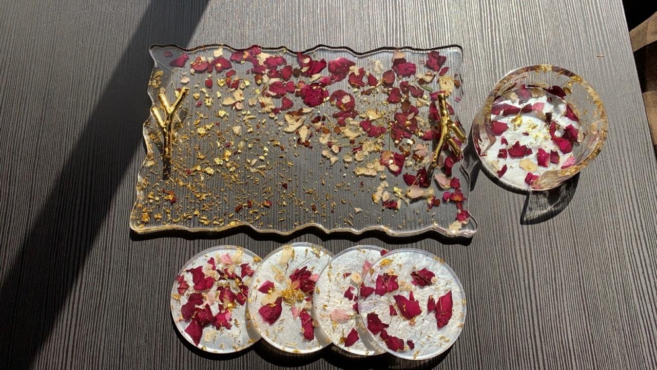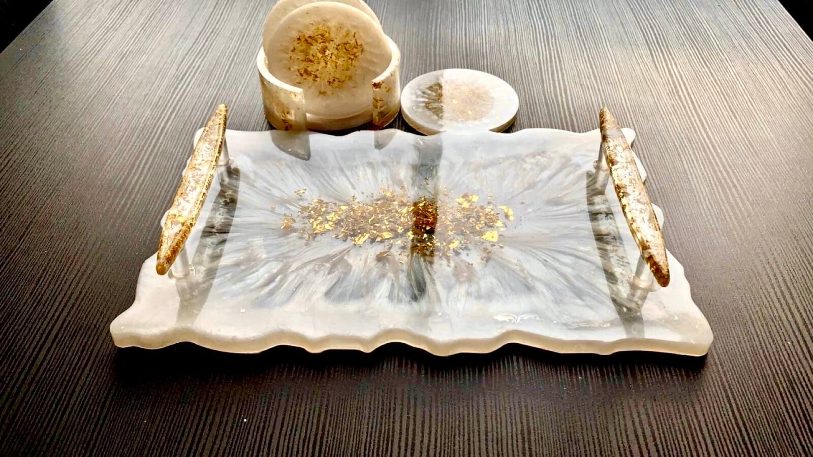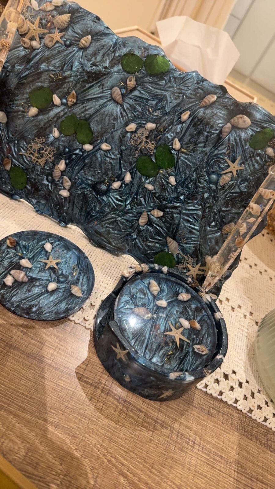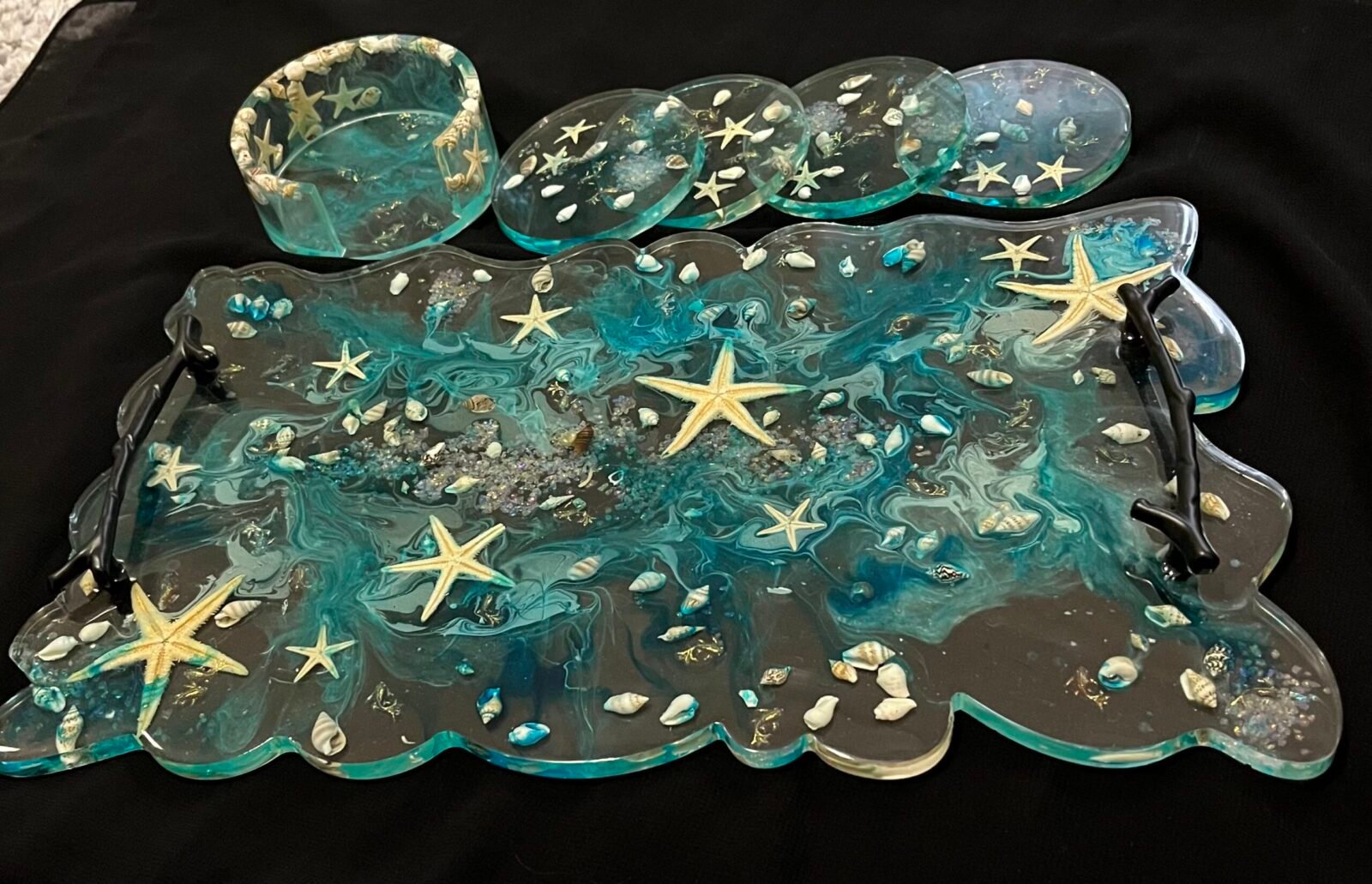 Serving tray +4 cup holders with their base made of Rizen, available in two sizes, large and small, with the possibility of the customer’s choice of additions of flowers and marine shapes